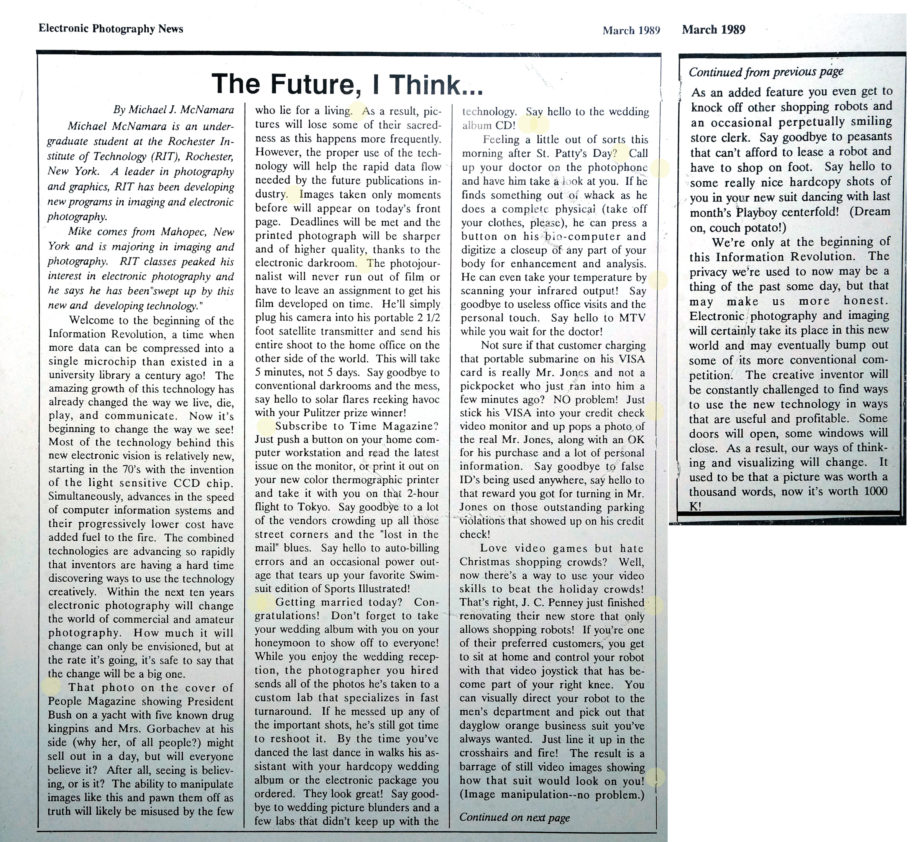 Article I wrote for Prof. Doug Rea’s Electronic Photography course at RIT in 1989 (A+), and later published by John Larish in the Electronic Photography newsletter. Article accurately predicts the development of the PhotoCD (three years before Kodak introduced it), using a “photophone” to diagnose illness (reality more than a 2 decade later), online shopping, and several other “future” advancements (see yellow dots).